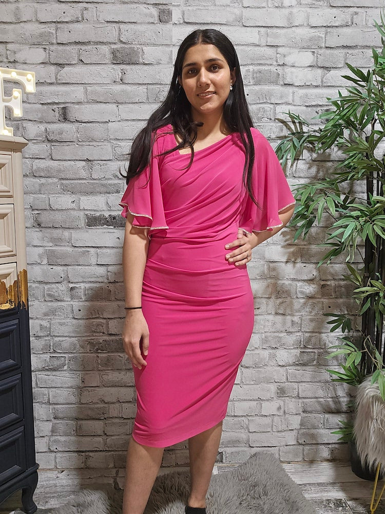 Elevate your style with this Silky Knit And Chiffon Sheath Dress. This elegant dress features a form-flattering sheath silhouette and stunning chiffon butterfly sleeves for added drama. Pleats and trim at the sleeves enhance the design, while the asymmetrical neckline makes it a true statement piece. Part of our Signature collection, it's pure luxury and sophistication. Feel confident and captivating in our Silky Knit And Chiffon Sheath Dress.