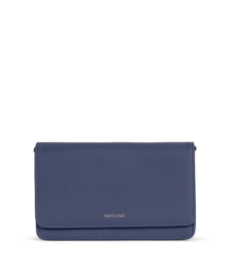 Bolso bandolera estructurado con asa extraíble y ajustable. Solapa frontal con cierre magnético. Refuerzo lateral en acordeón. Interior: 12 ranuras para tarjetas, 2 compartimentos para billetes, bolsillo para monedas con cremallera, parche Purity con el logo en relieve, forro 100% poliéster reciclado.