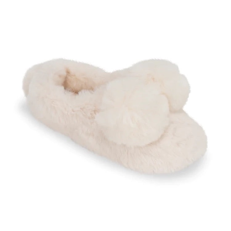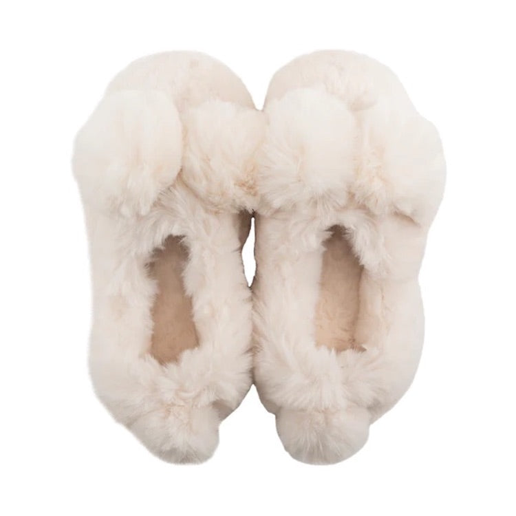 Añade un toque de perfección a tu look de descanso con estas pantuflas mullidas, rematadas con dos pompones para una máxima ternura.
