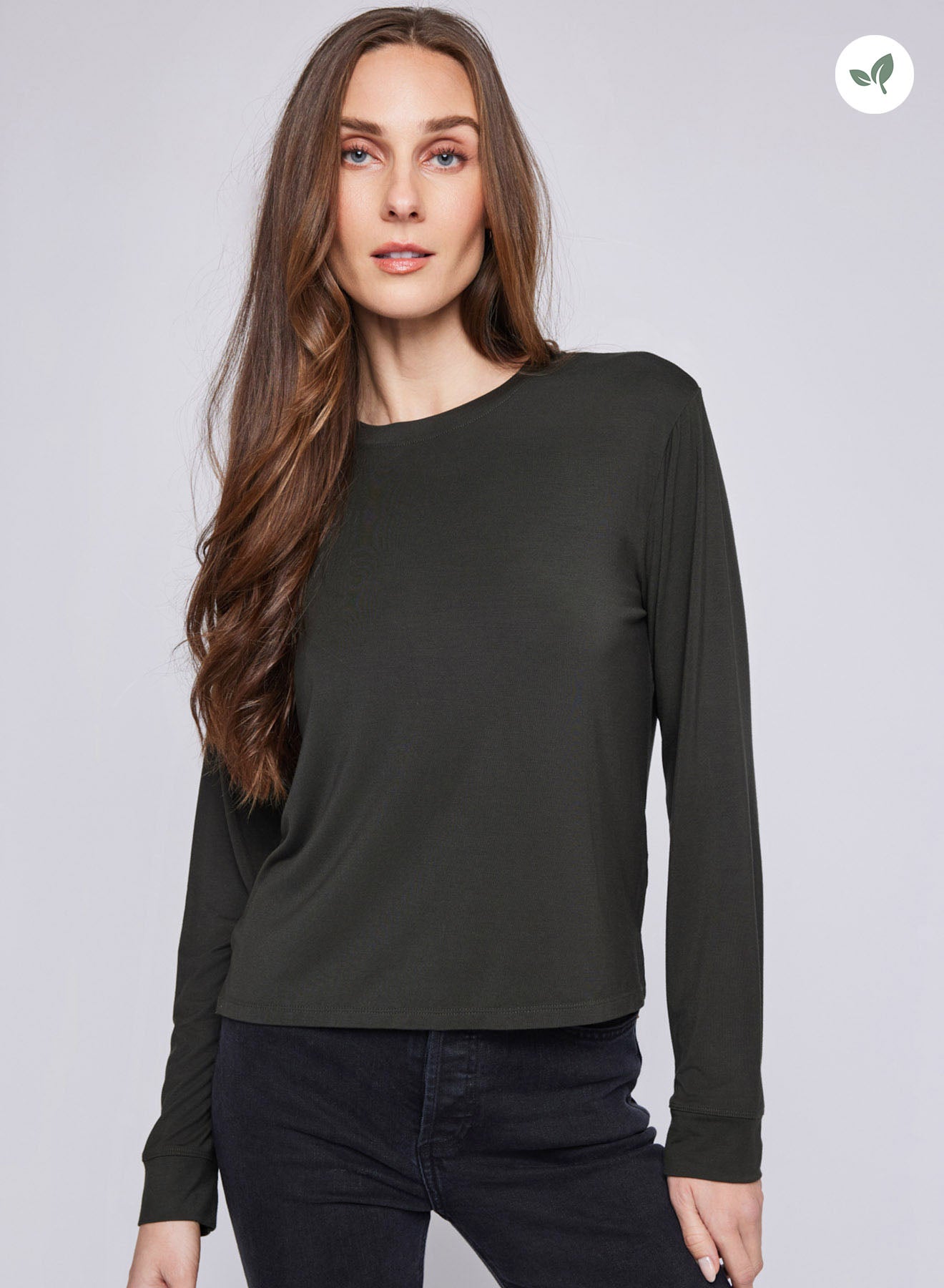 Experience ultimate comfort with the Trudy Long Sleeve Top! Made from luxurious EcoVero rayon jersey, this top boasts a crew neckline and side slits for a modern twist. Look and feel amazing while reducing your environmental impact.