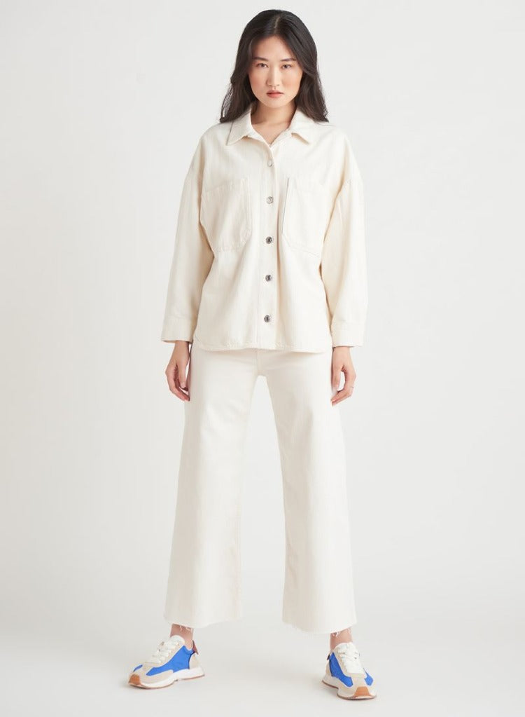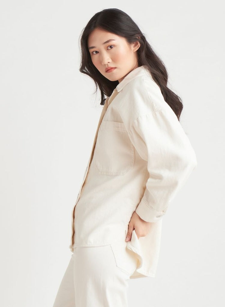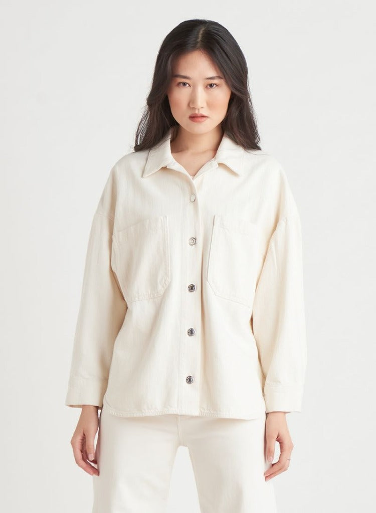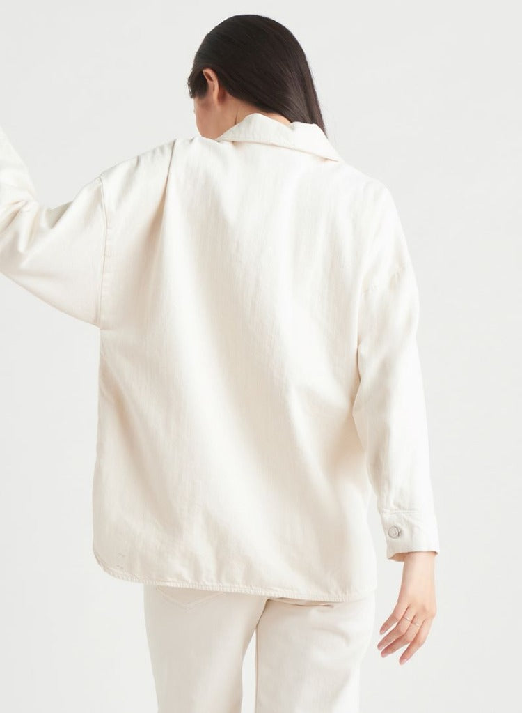 Dex vous propose une jolie veste en jean ample qui est une pièce parfaite à porter seule avec son style chemise ou à ouvrir en superposition sur une robe ou une chemise à motifs.