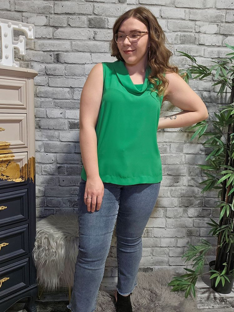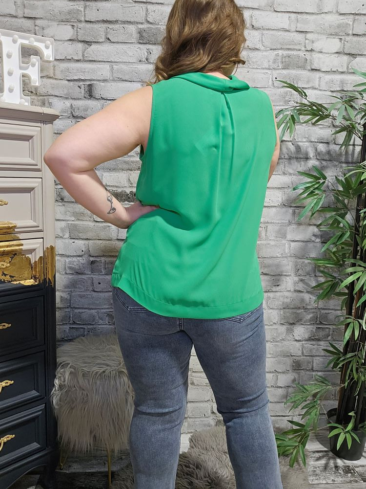 Add a touch of island green to your wardrobe with our Draped Neck Sleeveless Top. Perfect for any dressy occasion, this top features a flattering draped neck and sleeveless design. Elevate your style with this unique and chic piece!