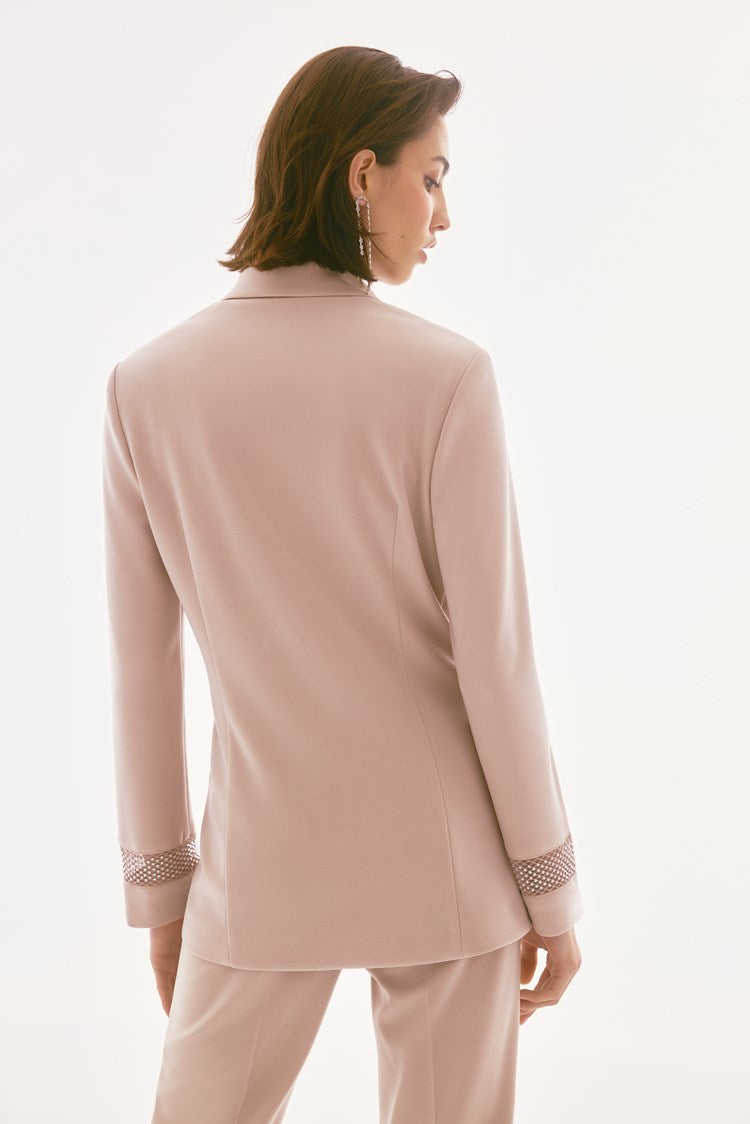 Elevate your look with the Minimalist Business Blazer. A tailored and silky knit blazer adorned with sparkling mesh cuffs and a rhinestone button closure. Perfect for special occasions or a fancy dinner out. Complete the ensemble with its matching pants. Unleash your inner poshness!