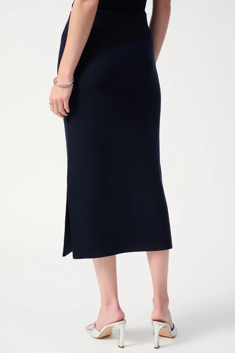 This minimalist high-rise midi skirt by Joseph Ribkoff exudes elegance with its pencil silhouette and sophisticated slit. Embodying the essence of minimalism, this midi-length skirt is a tasteful addition to any wardrobe. Indulge in the luxury of refinement every time you wear this exquisite piece.