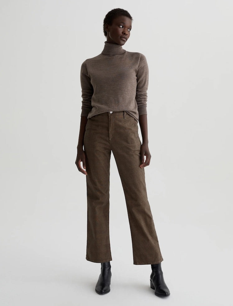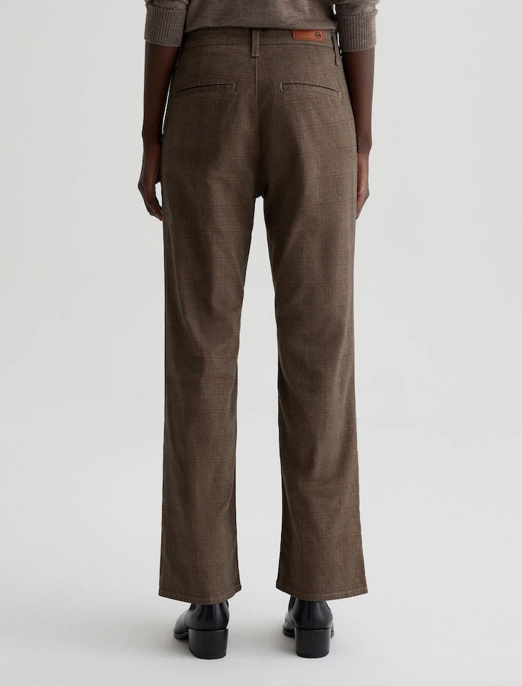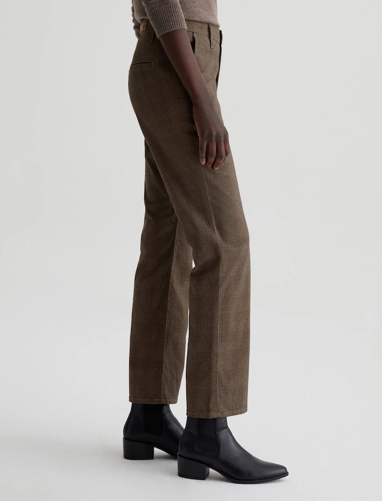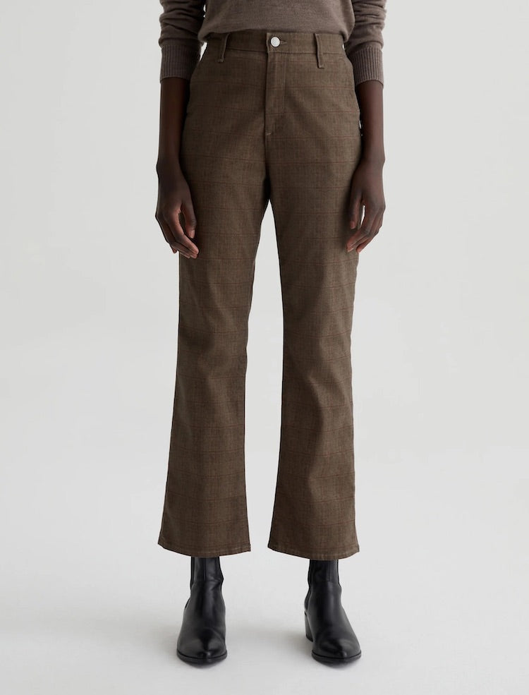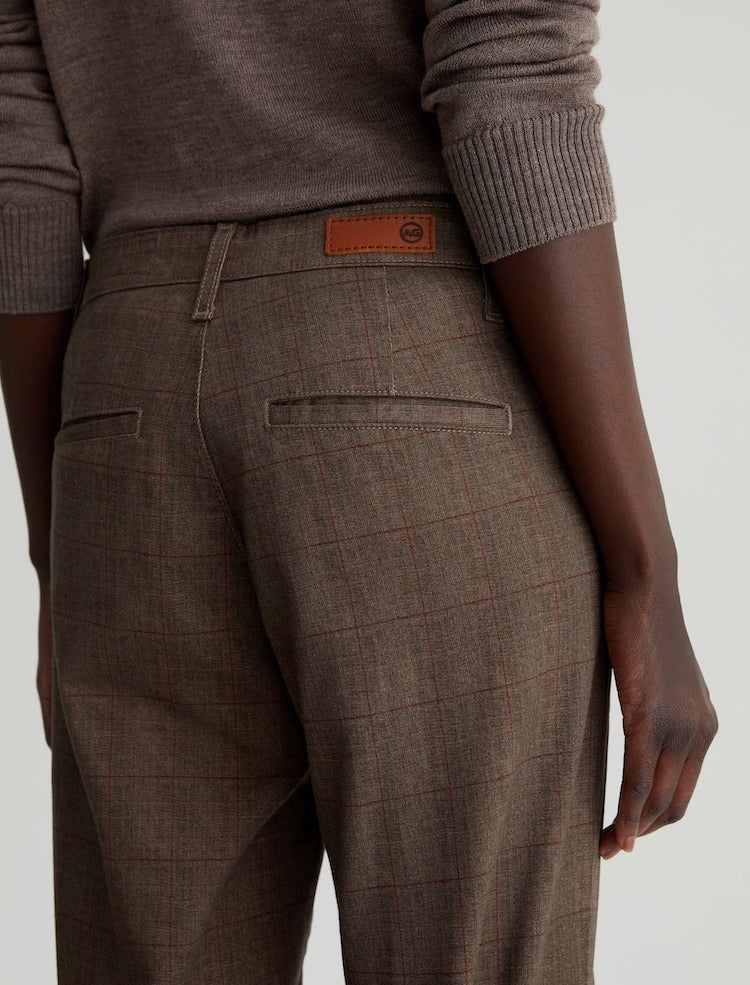 Kinsley est un pantalon moderne avec 8,4 oz. Fabrication en satin extensible suédé avec un motif à carreaux marron. Ce modèle taille haute légèrement raccourci présente des poches coupées sur le devant et des poches passepoilées à l'arrière, ainsi que des ourlets subtilement évasés.