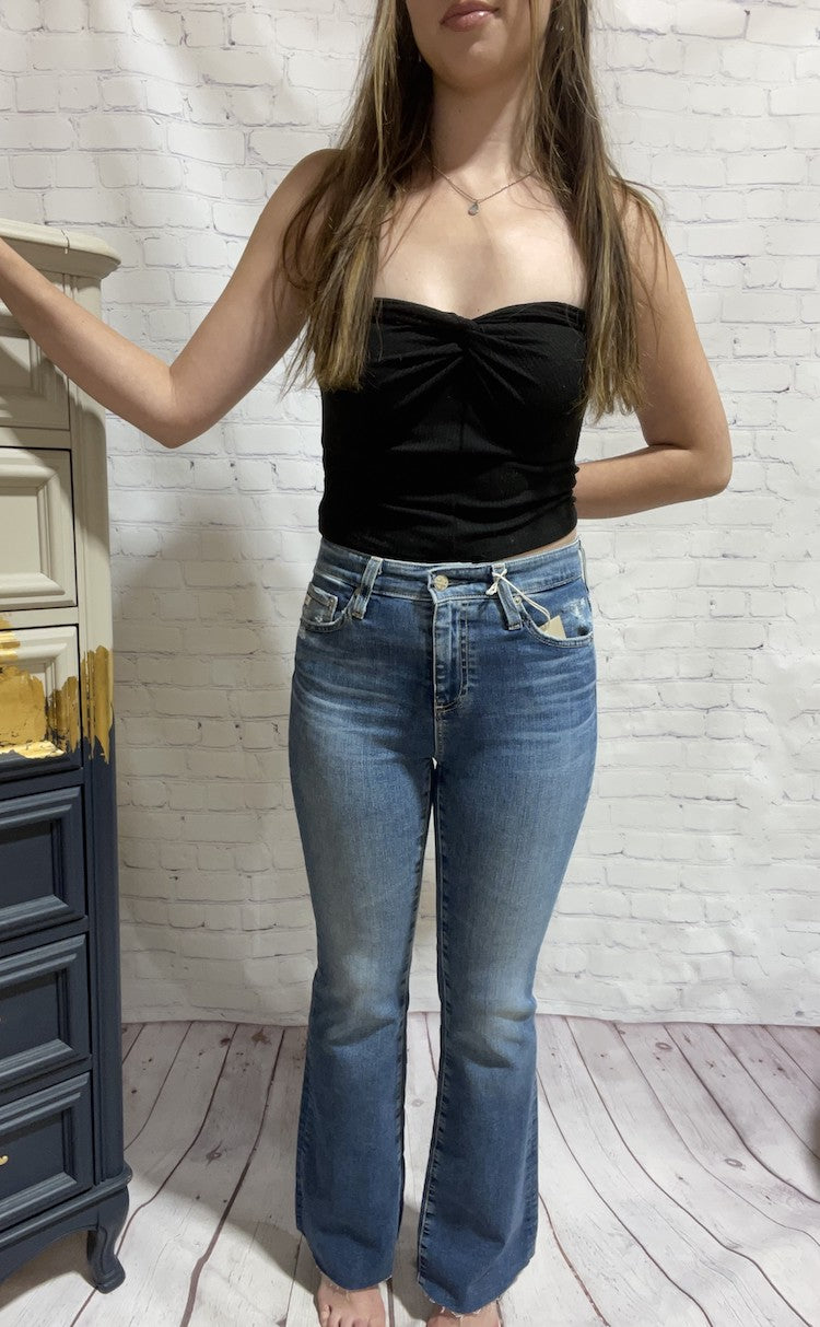 This women's bootcut jean, the AG Farrah, is high-rise with a skinny fit, 14-year vintage fade, 10-oz. Rouge Advance Stretch Denim for a flattering, comfortable shape and impressive recovery. Raw hems and distressing around the front pockets complete the medium indigo wash.