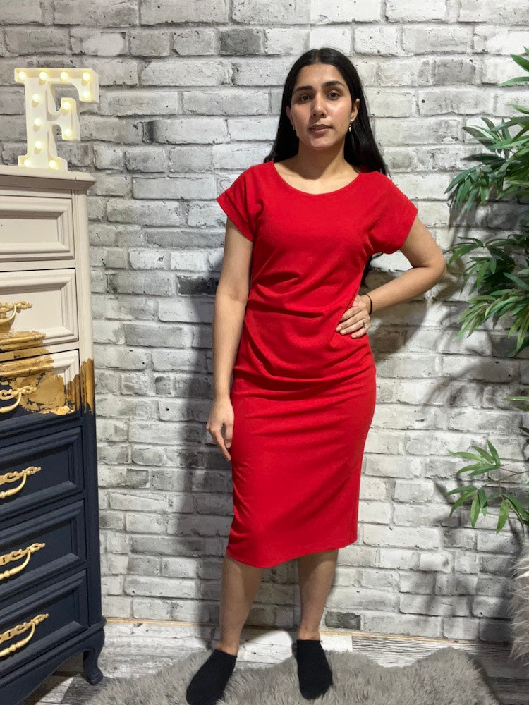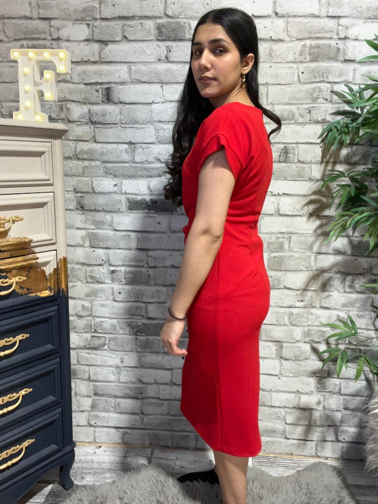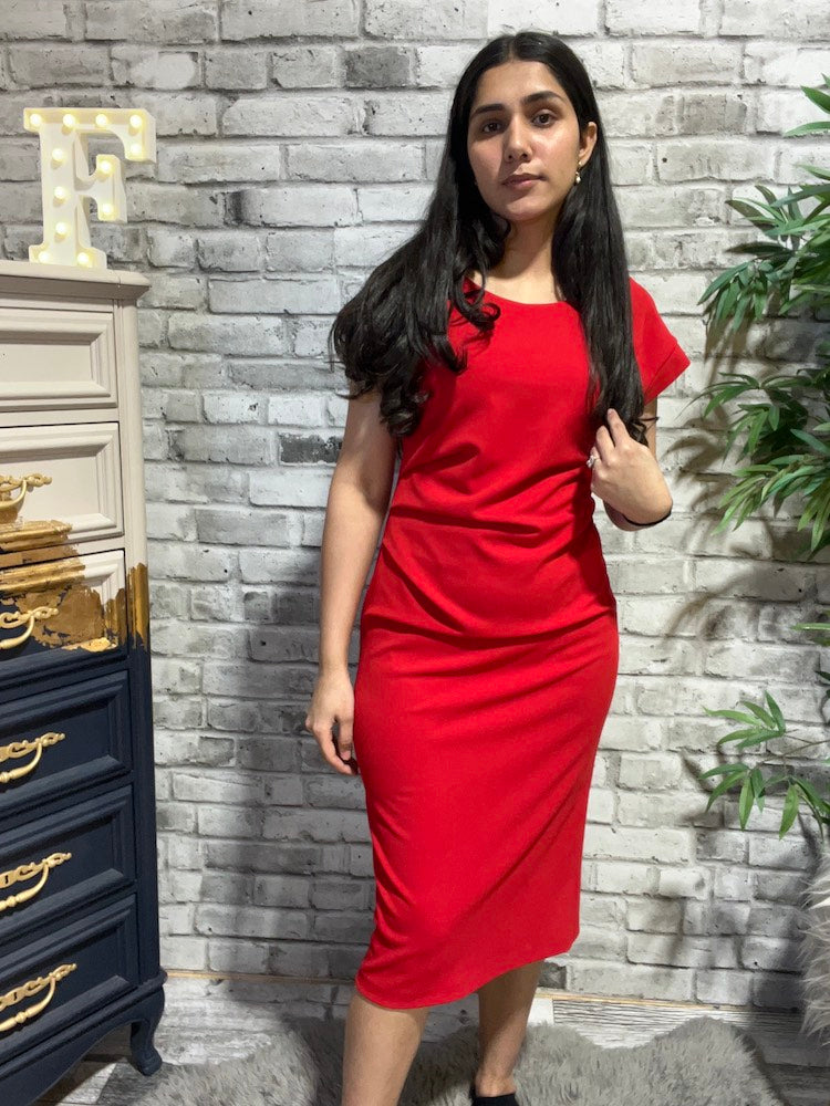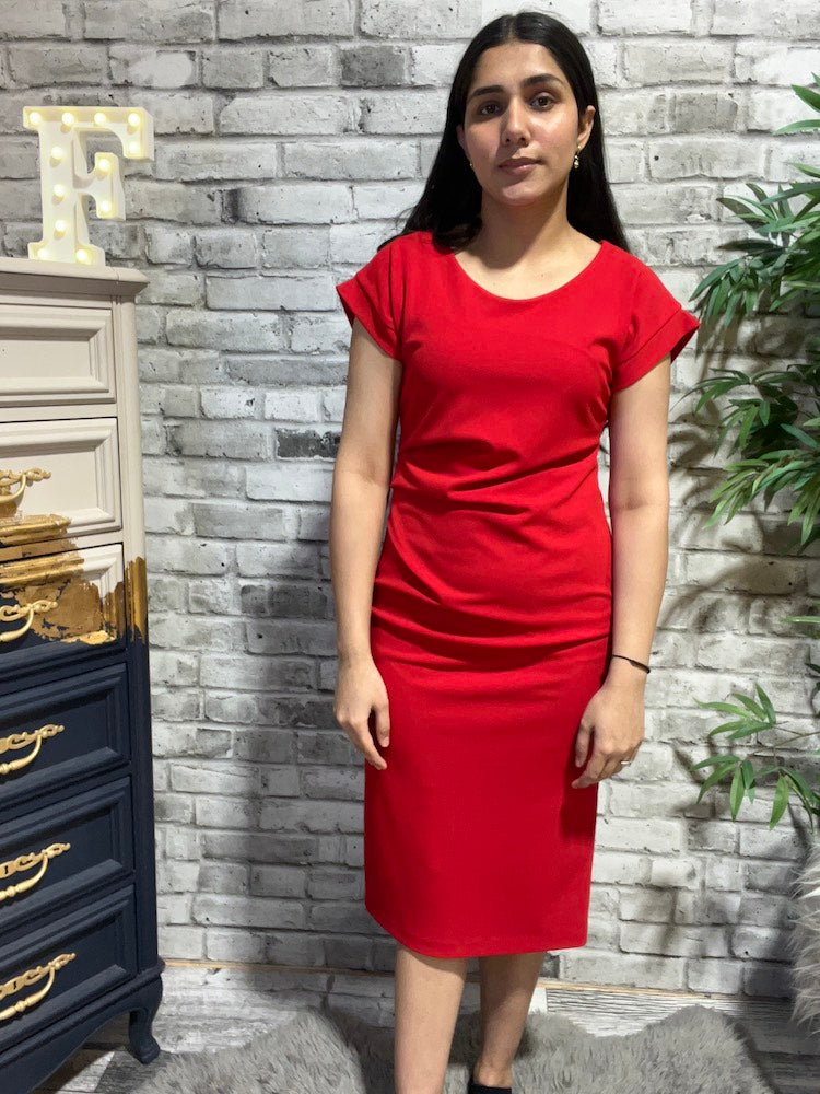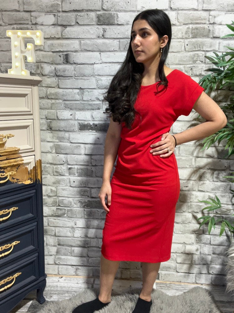 Step into effortless sophistication with this Casual Boat-neck Shift Dress. Made from scuba crepe, this dress features a sleek scoop neckline and short dolman sleeves with cuffs, adding timeless charm. The sheath silhouette and chic back slit flatter your figure, while the pleated detail on the waist adds an irresistible touch.