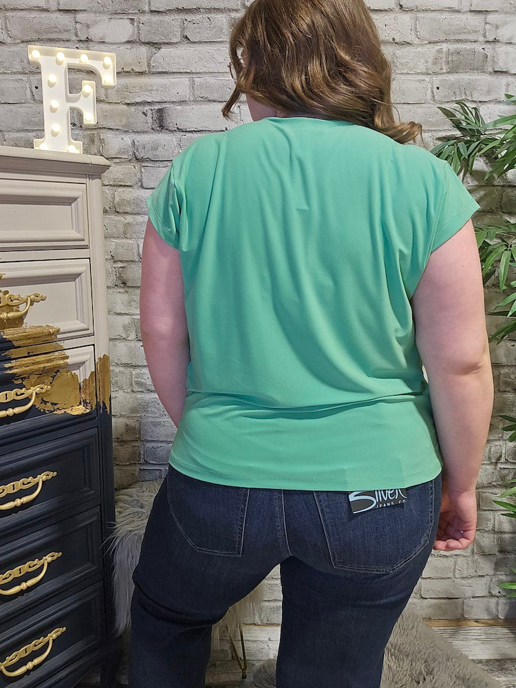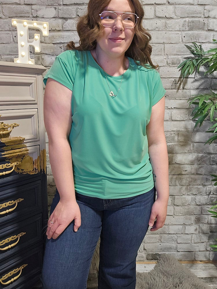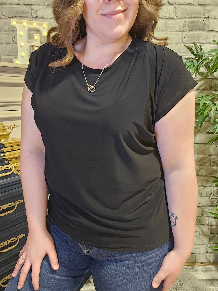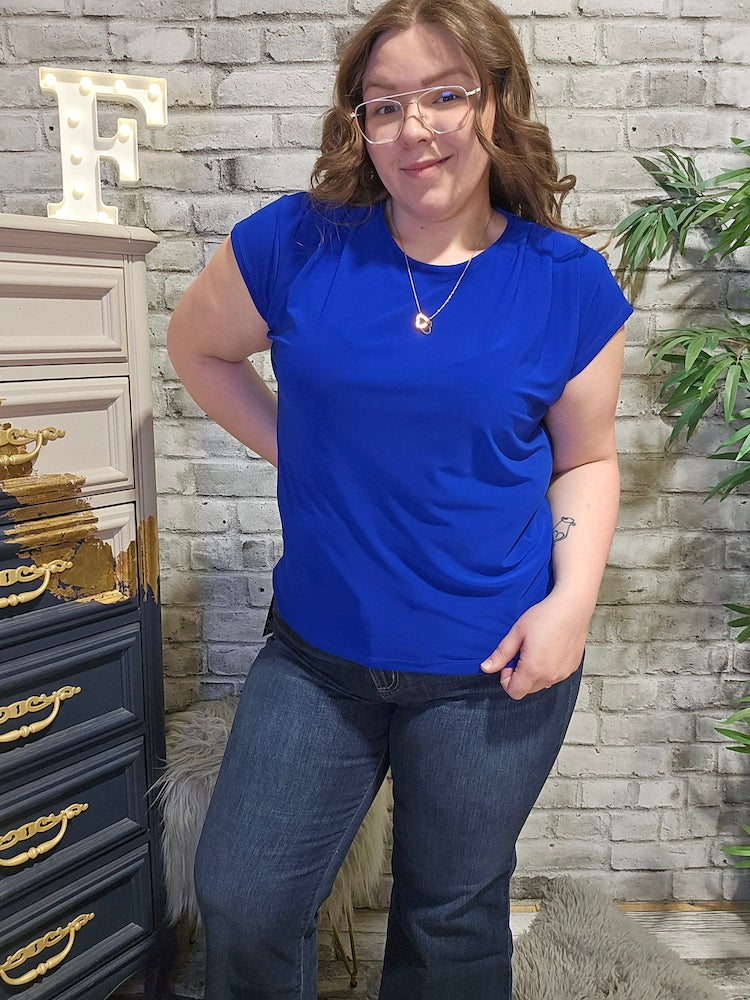 Elevate your wardrobe with this Casual Crew Neck Pullover. The silky knit fabric offers a touch of luxury, while the crew neck and short cap sleeves add a sweet and simple touch. Delicate pleated details at the shoulders add a sophisticated flair. Perfect for layering or wearing on its own for a chic look.