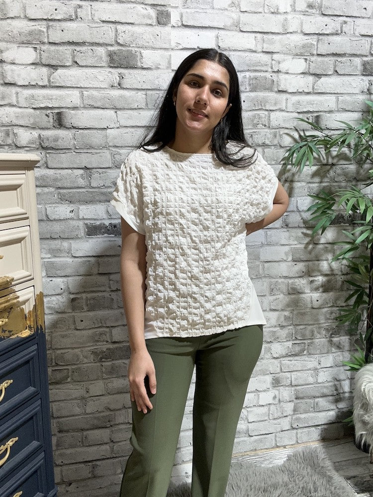 Elevate your casual wardrobe with this Bubble Jacquard Crew Neck Pullover. The unique combination of bubble jacquard and silky knit adds texture to this top, while the scoop neck and dolman sleeves with cuffs create a flattering silhouette. Effortlessly chic, this top is perfect for any occasion.