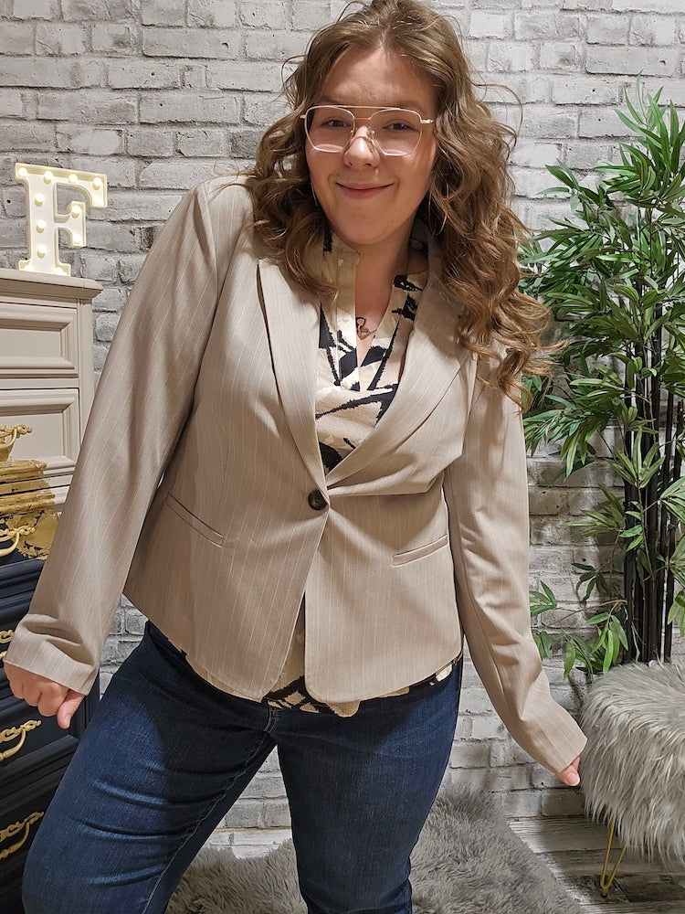 Elevate your style game with the KAesther Shaped blazer. Designed with a pinned stripe and a fitted, waist-length silhouette, this blazer exudes confidence and sophistication. Make a statement at work or a night out with this shapeful blazer.