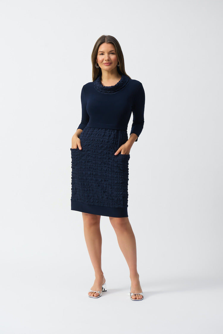 Indulge in luxury and glamour with this Knee-length A-line Dress! Made from a fusion of bubble jacquard and silky knit, this dress features shirring at the empire waist for a flattering cocoon silhouette. The elegant three-quarter sleeves and practical front pockets add refined charm, while the stand collar with back button opening completes the look.