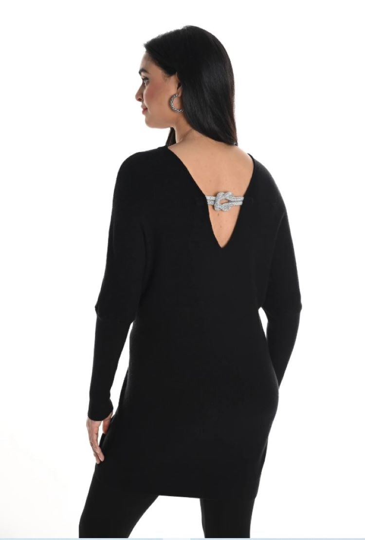 Fall in love with the versatility of the Frank Lyman Long Sleeve Open Back Tunic in black! This gorgeous knit top is both lightweight and cozy, draping beautifully on your body for a stylish and comfortable look. Perfect for any occasion, from casual outings to special events!