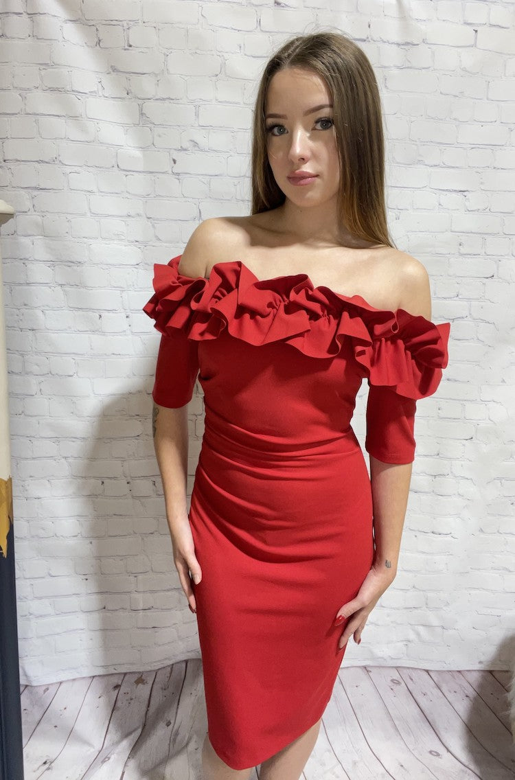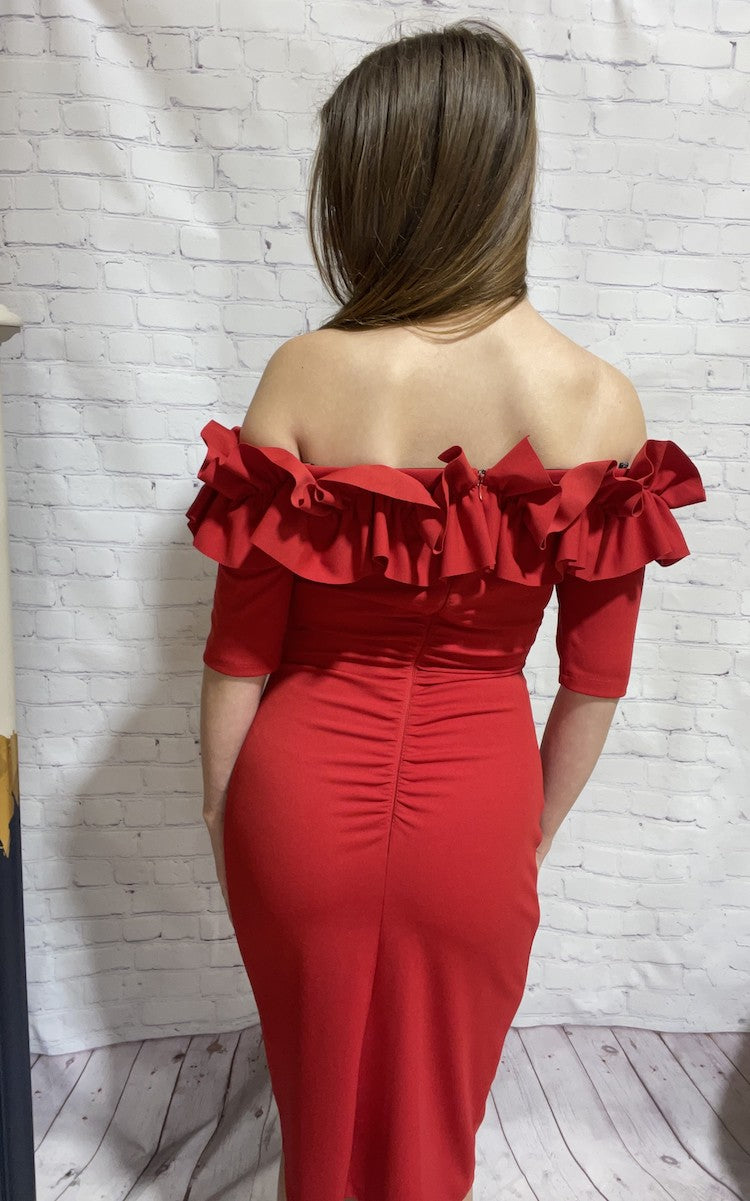 This sophisticated off-shoulder dress from scuba crepe is perfect for special occasions. The eye-catching ruffled neckline, pleated front and back details, and three-quarter sleeves combine to create an unforgettable look. Paired with statement heels and glistening jewelry, the convenient back zipper makes for easy wear ability.