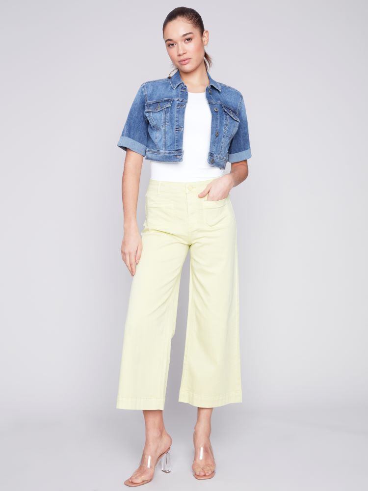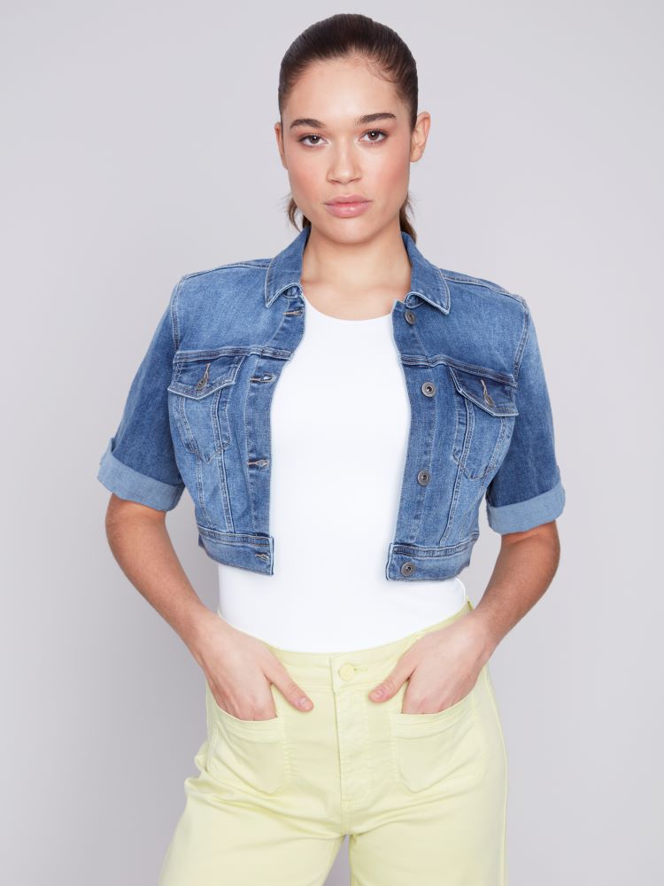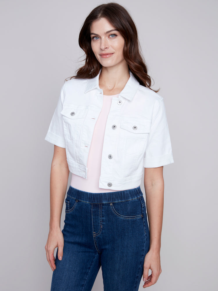 The Short Sleeve Cropped Jean Jacket by Charlie B is a perfect addition to your wardrobe. Designed with short sleeves and a cropped length, this jacket offers a unique and stylish twist on the classic jean jacket. Perfect for any season, this jacket adds a touch of edginess to your look while keeping you comfortably cool.