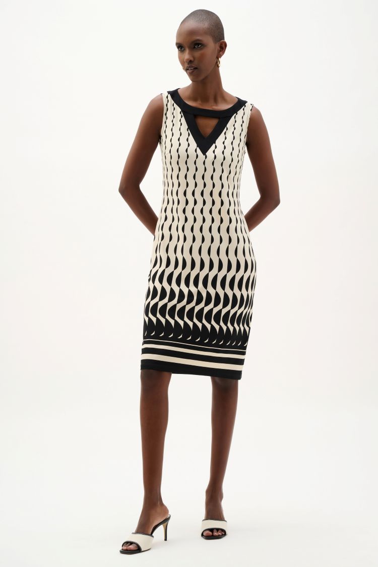 Elevate your evening wardrobe with the Joseph Ribkoff knee-length bodycon dress. This sophisticated piece combines a flattering V-neckline and sleeveless silhouette with an eye-catching abstract pattern and jewel cut-out accents. The form-fitting design hugs your curves beautifully, making it an ideal choice for formal events, cocktail nights, or any occasion where you want to make an unforgettable impression. Versatile enough to dress up or down, this dress delivers timeless elegance with modern flair.