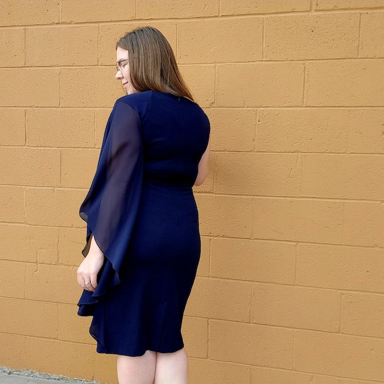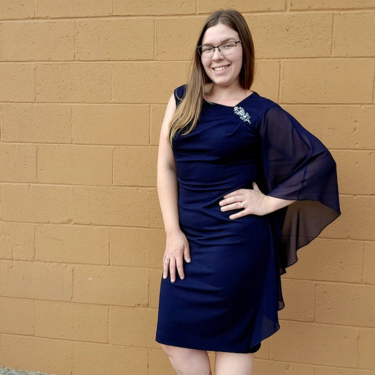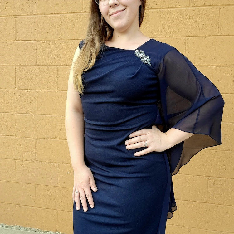 This exquisite sheath dress from the Signature Collection features a lustrous scuba crepe material with incomparable draping and a dramatic chiffon sleeve on the left. It also has a shimmering rhinestone ornamentation on the left shoulder, an asymmetrical neckline, and short statement sleeves.