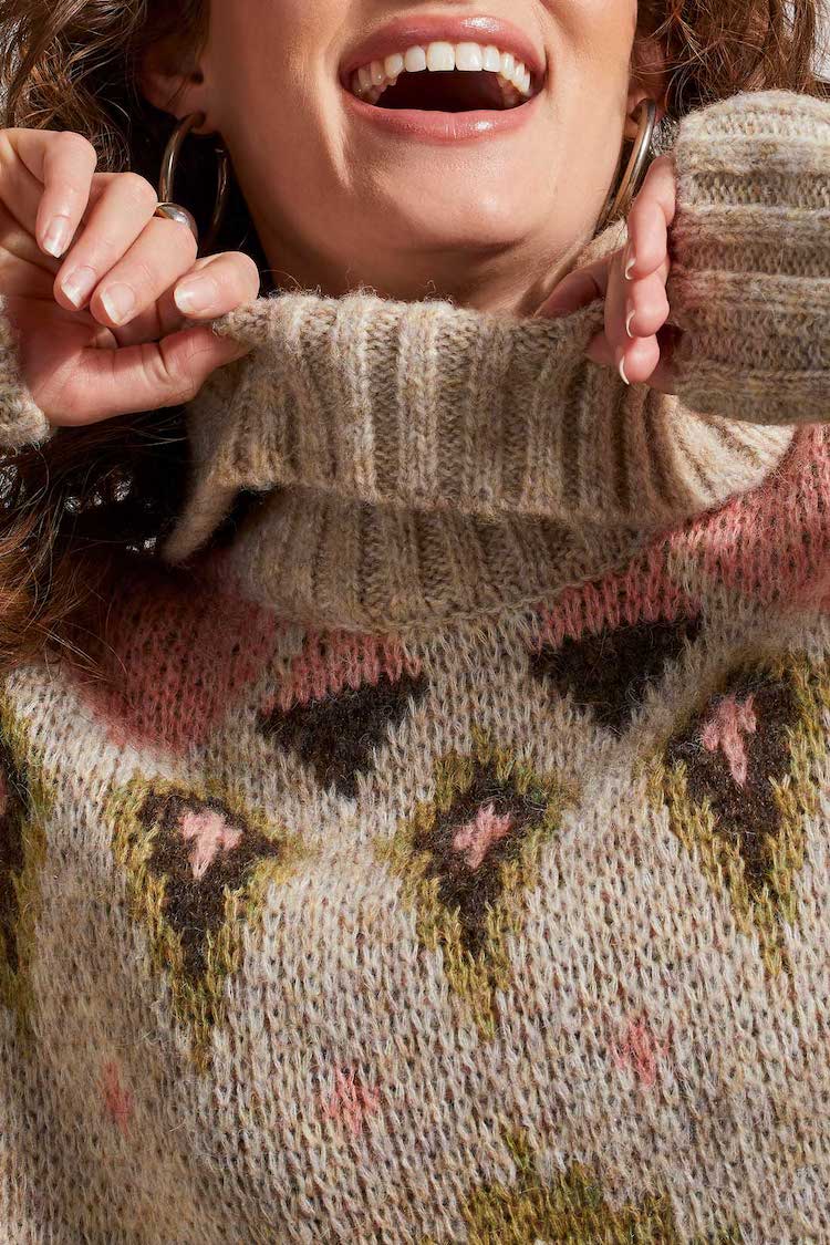 This Turtleneck Sweater is a stylish way to elevate your everyday wardrobe. It features two distinct patterns on the front and back, and its interior has a distinct appearance from the exterior. The contrasting colors of the patterns provide an eye-catching visual element when paired with jeans for your daily errands.